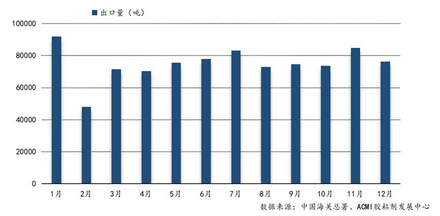 2022年1-12月中國膠粘劑出口數(shù)量月度變化趨勢