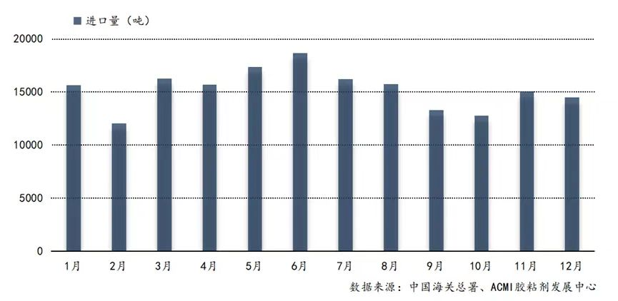 2022年1-12月中國膠粘劑進口數(shù)量月度變化趨勢